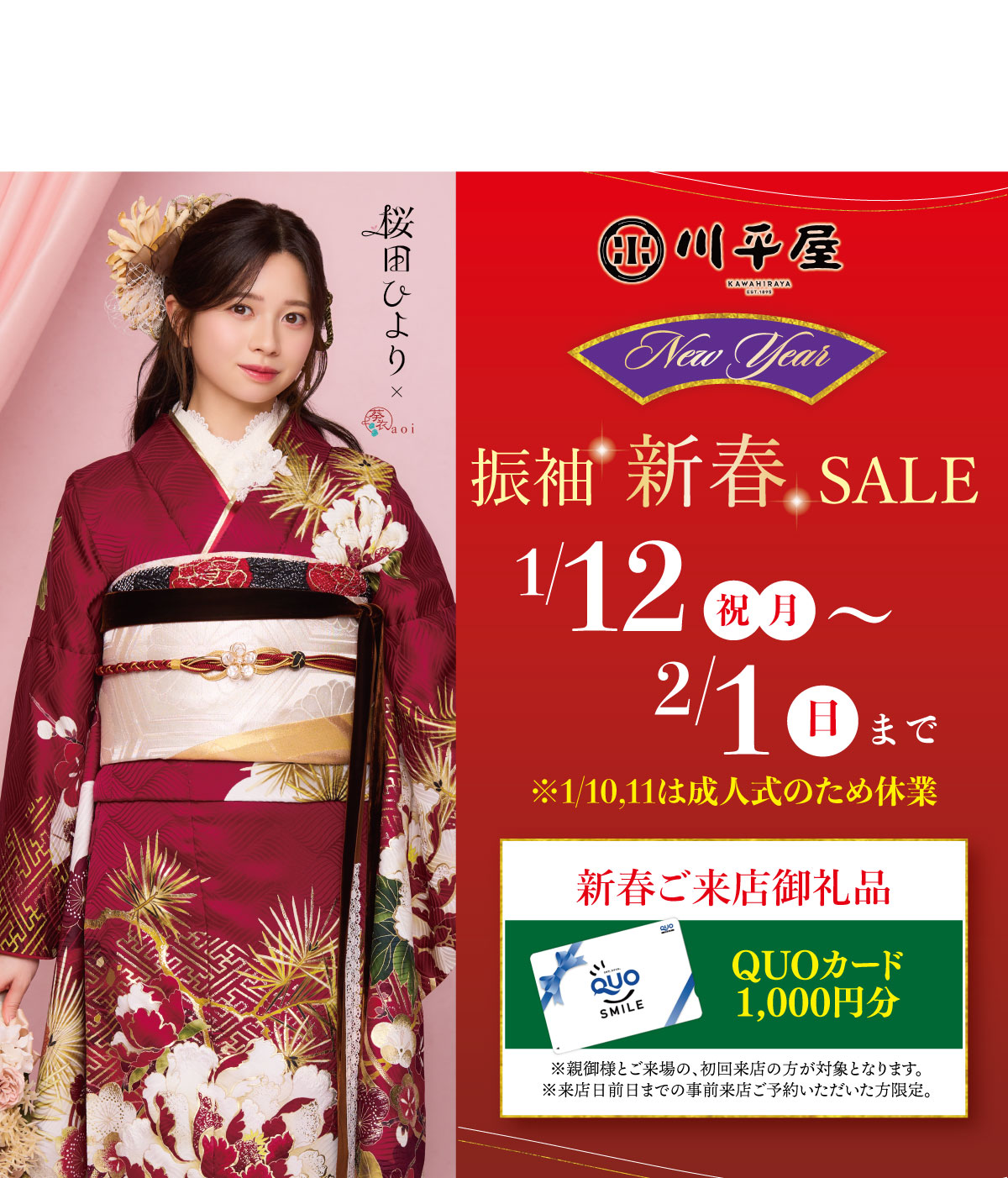 川平屋なら、お買い上げでもレンタルでもママ振でも、お嬢様が振袖を着用するために必要な大満足のサービスが全て揃っています。