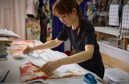身体に当てて色や柄を見ながら、顔映りをチェックします。