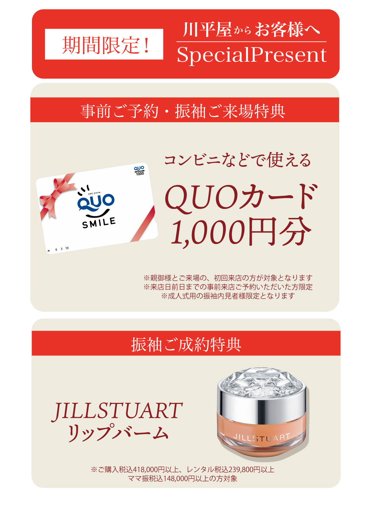 ※ご来場特典、制約特典は成人式のお振袖をご成約の方が対象のため、撮影のみの方は対象外となっております